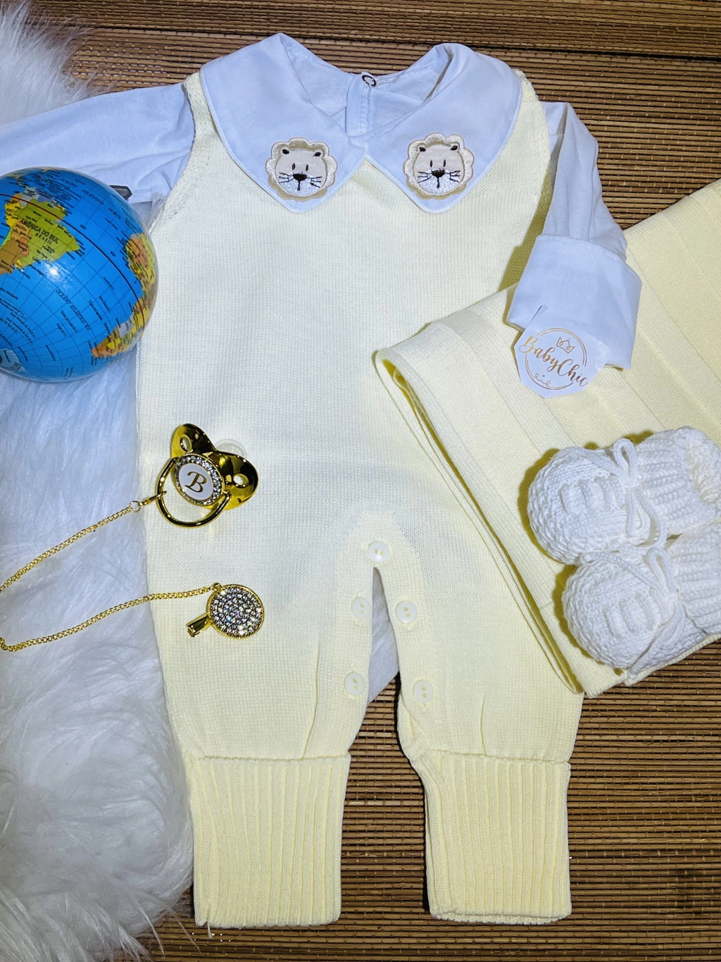 Jardineira e manta em tricô 100% acrílico hipoalergênico.